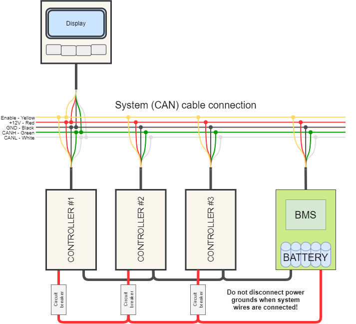 For example, for a two-motor connection scheme, which is used on all-wheel-drive electric scooters, in addition to the second controller, you will need a CAN-splitter and one more CAN wire (there are 2, 1.2, and 0.3 meters long). Each Controller has a standard CAN-wire 1.2 m long. These wires from both controllers must be connected to a CAN-splitter, and from it one CAN-wire connects directly to the On-board computer. In the On-board computer, you can configure both controllers are separate.