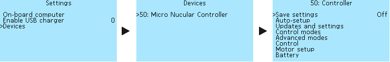 In the menu item Controller > Save settings you can save all the settings made. Press the right button of the Onboard-computer and select On to save. If you do not save the settings, they will be reset after restart.