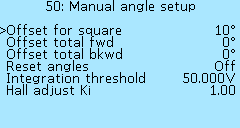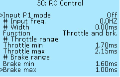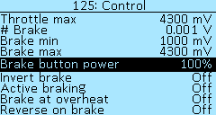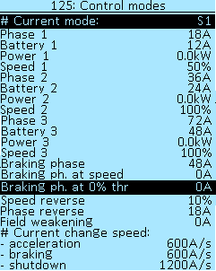 Braking ph. at speed — phase braking current during speed control, in Amperes (A). Select of values from 0A to 500A, in increments of 2A. This function allows you to slow down when you reset the throttle stick. Works only with Direct Drive motors, without a clutch.