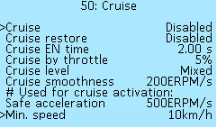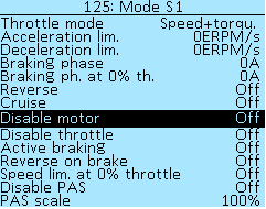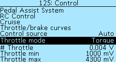 Also to use this mode should be selected: Speed or Speed and Torque mode in the Controller > Control > Throttle Mode menu item. In the menu item Controller > Control > Speed lim. at 0% throttle enable the speed limit at 0% throttle (optional), enable if you need braking with completely released throttle.