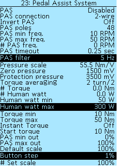 Phase — the maximum value of the phase current, in Amperes (A). Select of values from 0A to 500A, in increments of 2A. When setting, consider the maximum phase current of your controller type. In most cases, we recommend specifying the value of the phase current 1.5-2 times higher than the battery current.