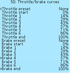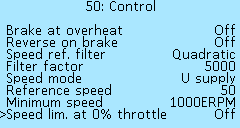 Braking ph. at 0% throttle — phase braking current with the throttle handle released, in Amperes (A). Select of values from 0A to 500A, in increments of 2A. This function allows regenerative braking to be initiated when the throttle is released.