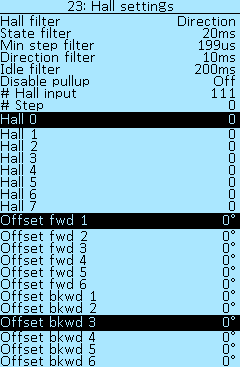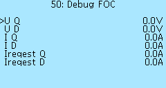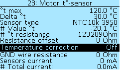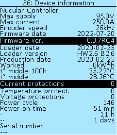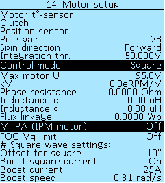 If only one throttle lever is connected, you must independently turn on the items step-by-step: Throttle, Motor LR, Motor, Angle correction. When you enable each of the menu items, the hints will be displayed. Auto-setup function Motor LR detects the inductance and resistance of the motor. You can see the measurement results in the menu section Controller > Motor setup, items Phase resistance, Inductance d and Inductance q.
