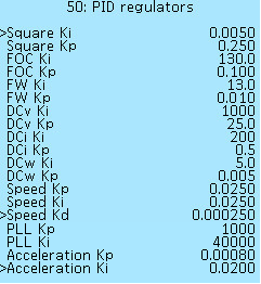 Field weakening — the magnitude of the field weakening current, in Amperes (A). Select of values from 0A to 500A, in increments of 2A. This setting allows you to increase the maximum motor speed and depends on the supply voltage, in any case, the speed will be no more than the maximum supply voltage (Vmax) of the controller (95V limit).