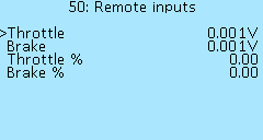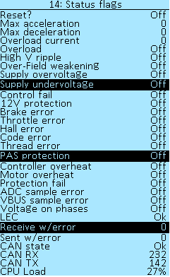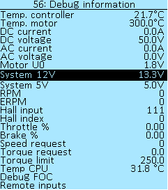 In the menu section Controller > Debug information > Remote inputs you can view the parameters of the throttle and brake levers connected to other devices connected to the CAN-bus (On-board computer or uLight).