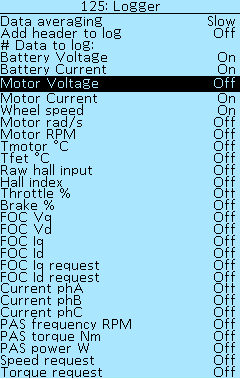 Continuous logging — allows you to activate the continuous logging mode, including during stops. In firmware before v0.8.12 the log was written only during driving and electric motor operation.