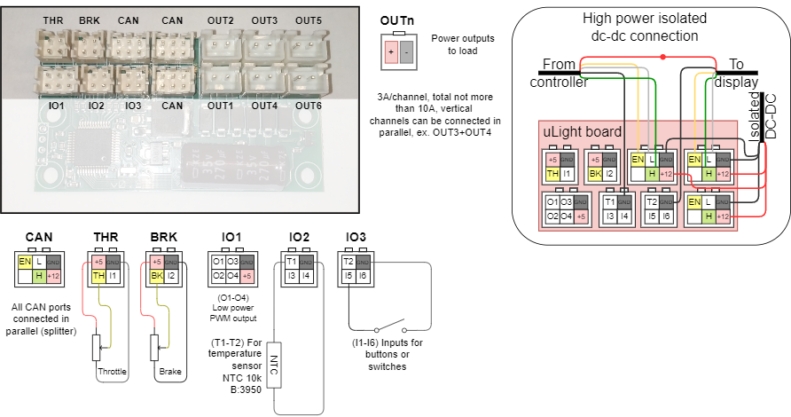 The uLight is a controller designed to control lighting equipment, such as turn signals, brake lights, headlights, or LED strips. The uLight board has three CAN inputs and can function as a CAN splitter. Video review on YouTube. The uLight does not have its own power supply.