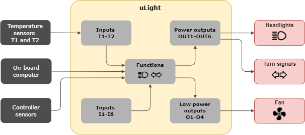 In this section, you can configure which output each function belongs to. The uLight has six power outputs OUT1-OUT6 (see the diagram above). All outputs are PWM frequency adjustable.