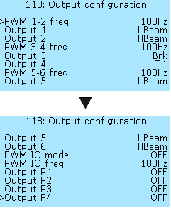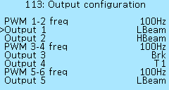 Taking into account the previously made settings for the functions, go to Output 1 and select the value LBeam (Low beam). Next, go to Output 2 and select the HBeam (High beam) value. You can leave the PWM frequency for a regular bulb at 100Hz.
