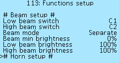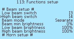 Next, select which output the low beam switch is connected to, for example, you connected a switch button to Output I3. Next, select which output the high beam switch is connected to, for example, to Output I4. It is impossible to assign the inclusion of low and high beam to one button, only to a switch or to two separate buttons. For a description of the Single and Separate beam modes, see above in the Beam setup menu section.