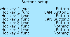 After connecting the headlight power supply, it is necessary to configure the On-board computer buttons. Go to the menu On-board computer > Buttons setup. All four front buttons of the On-board computer can be configured in the Hot key1-Hot key4 menu sections. Buttons activate functions when pressed and held while the Main screen is displayed.